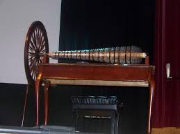 The glass armonica pictured here is on display in the "Franklin...He's Electric!" exhibit at the Franklin Institute. It was created in London by Charles James in 1761, made from Ben Franklin's own instructions. The instrument has a mahogany case and stand, and the musical glass bowls are supported on corks along an iron rod.